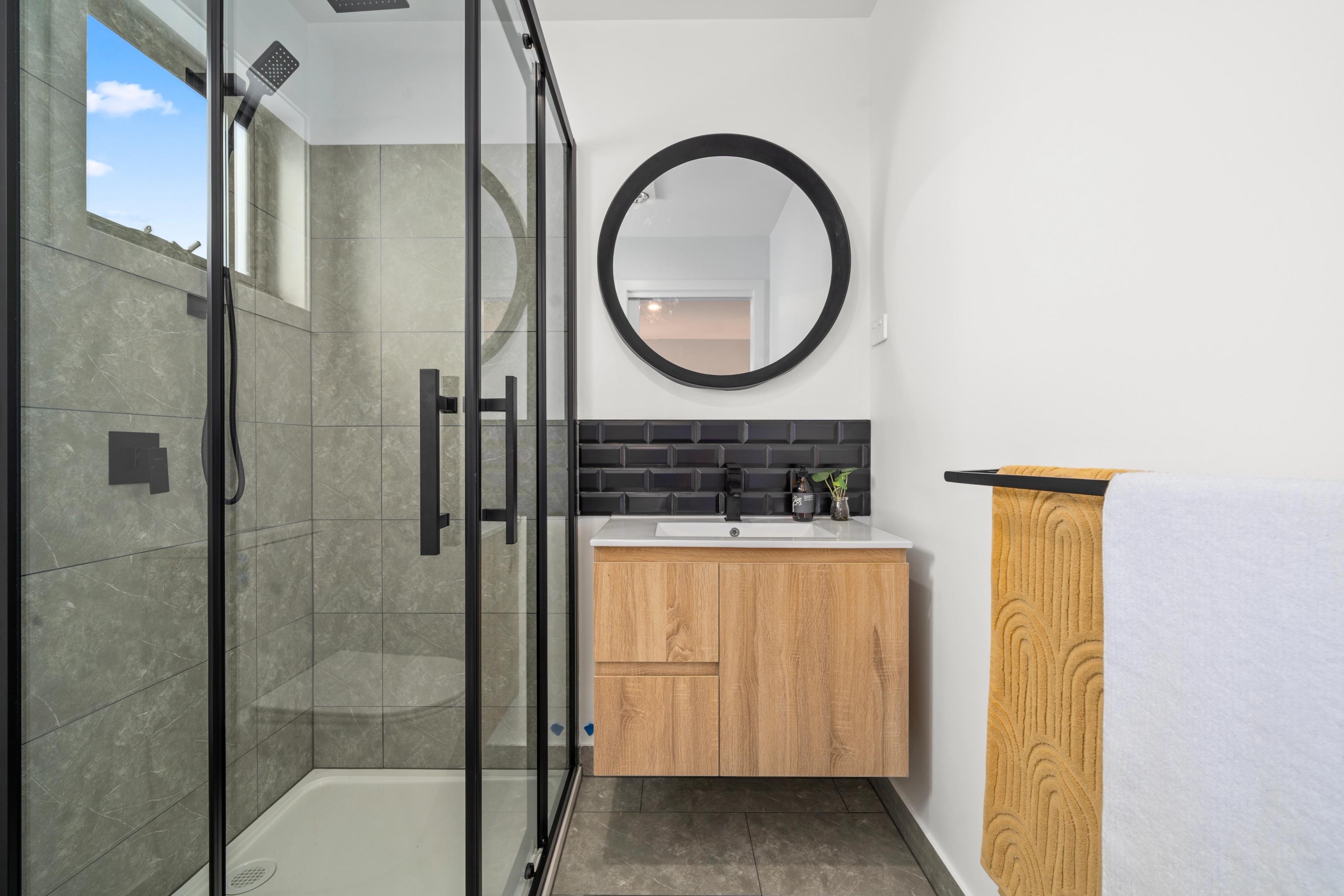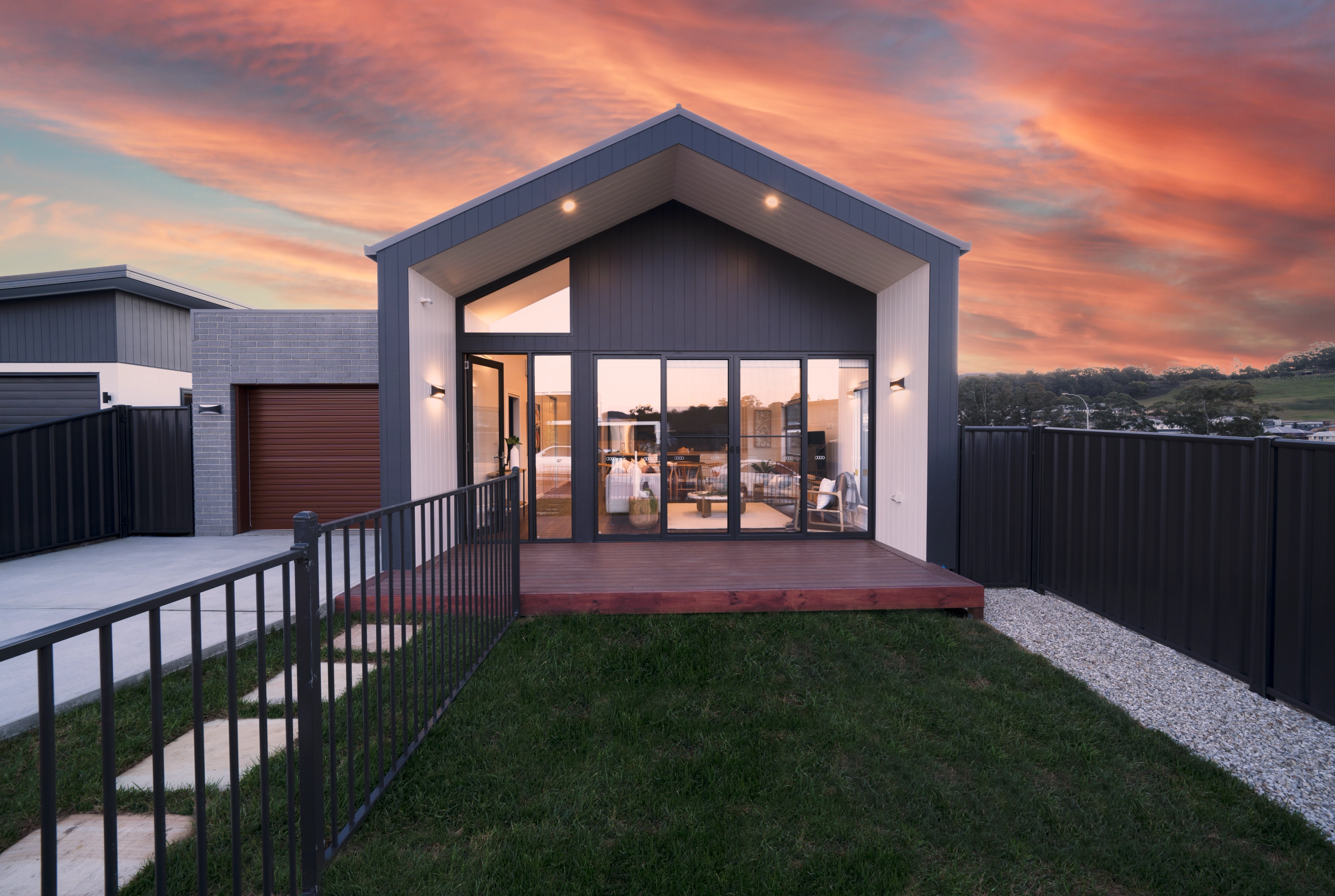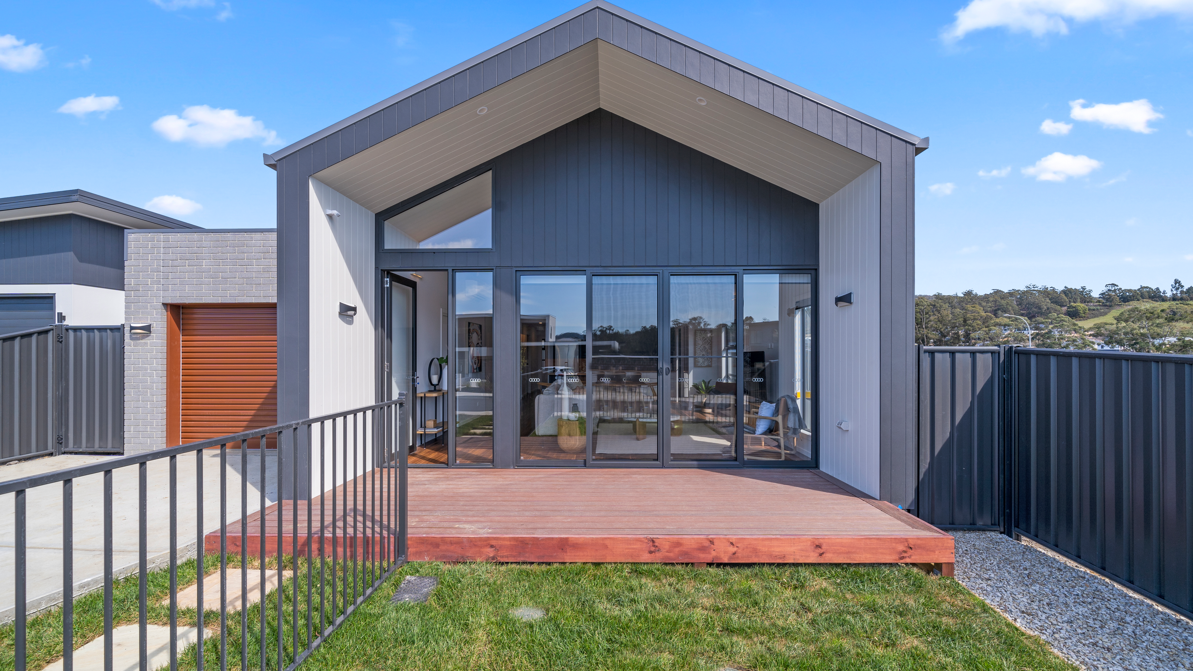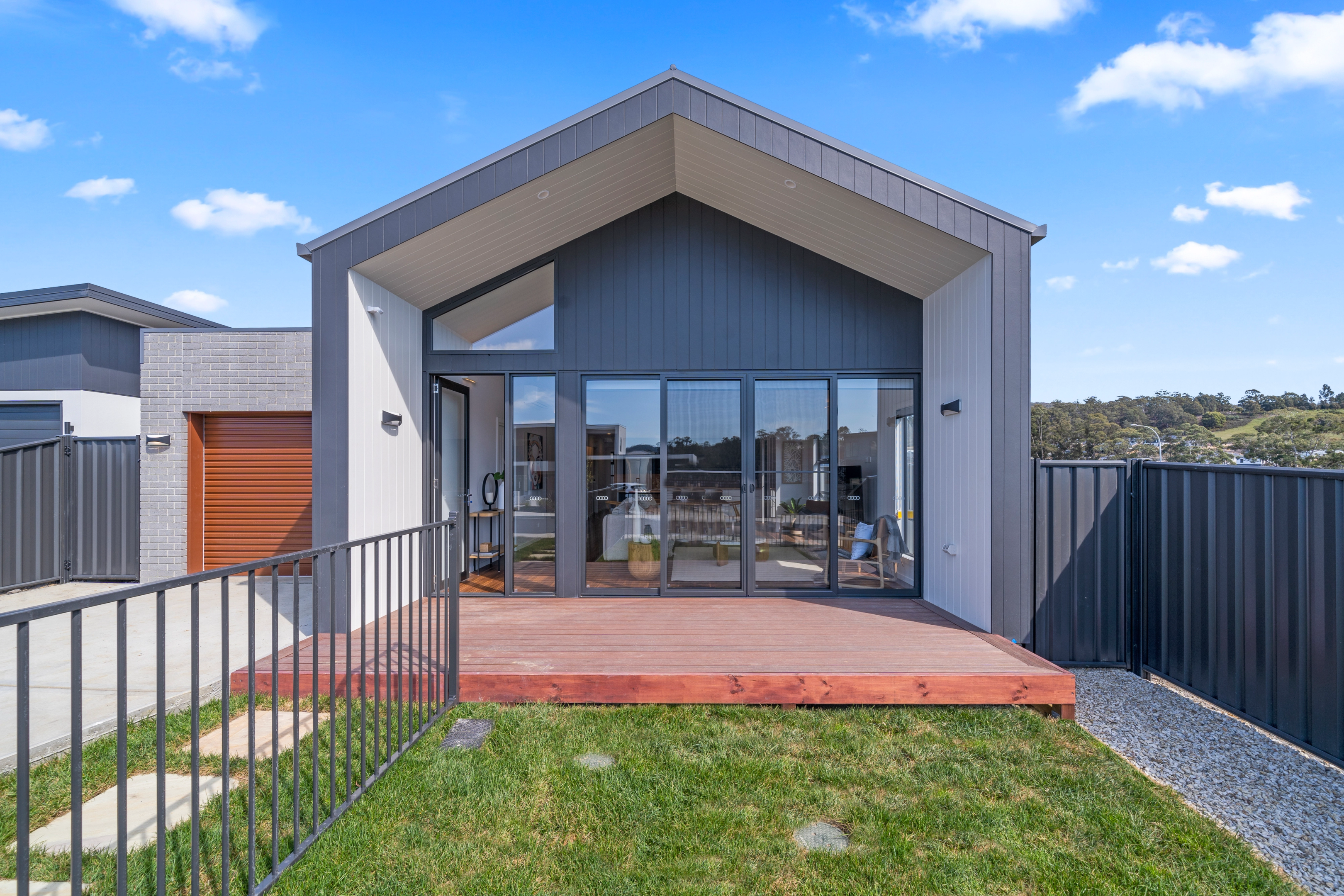 The exterior makes a confident statement with its strong gable roofline and clean architectural form. Vertical cladding enhances the height and visual impact, while oversized glazing allows natural light to pour into the interior spaces.