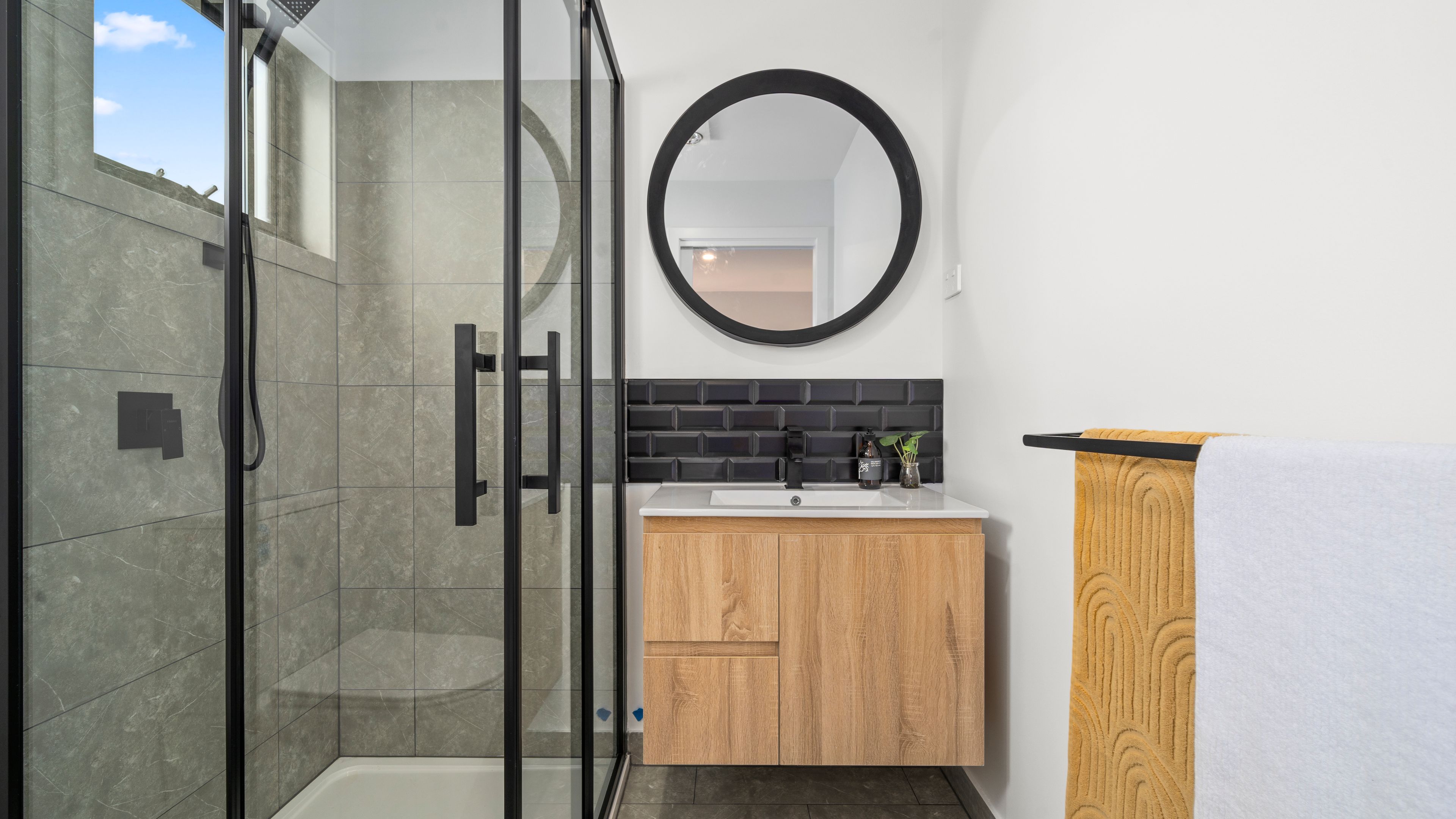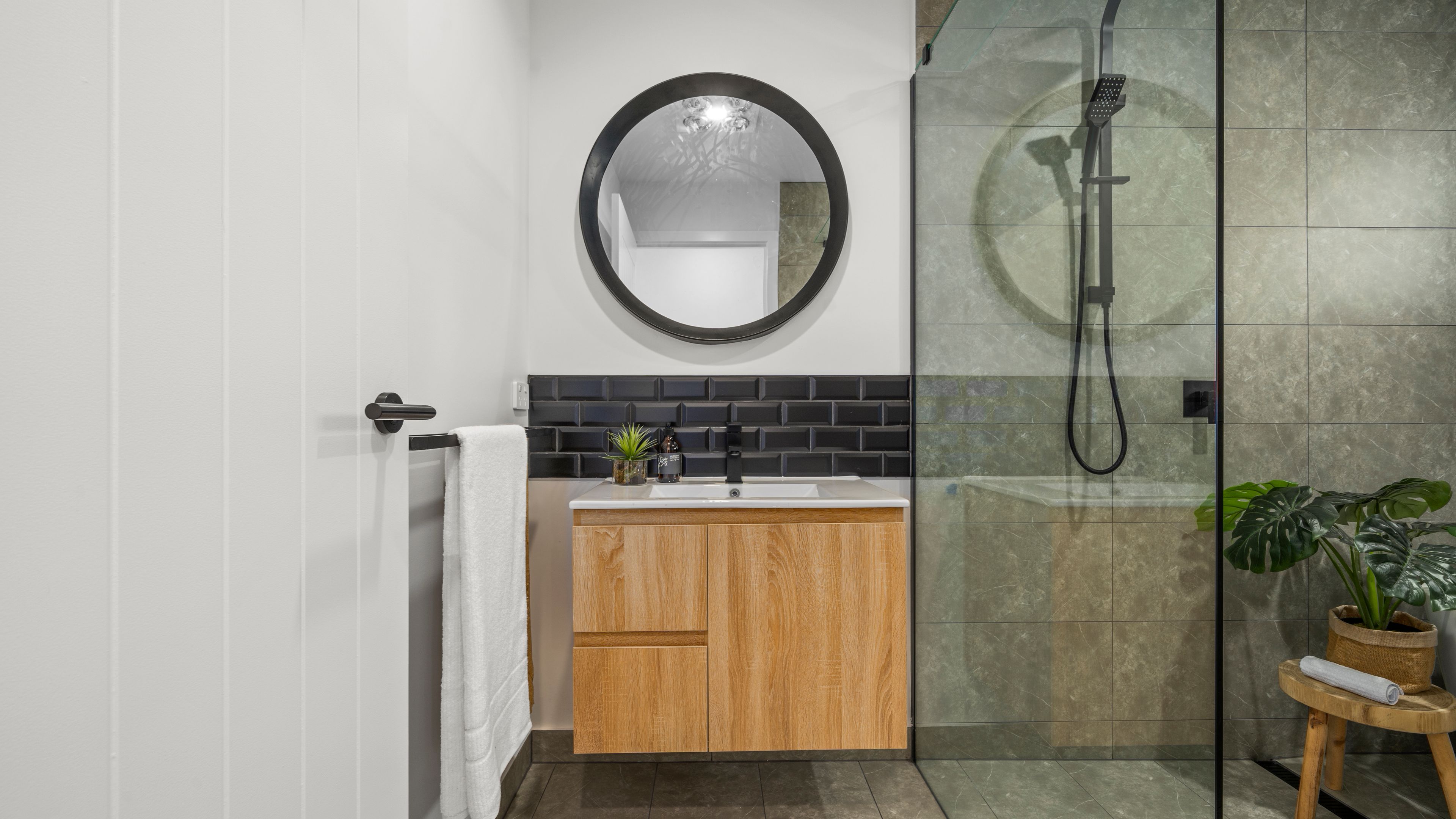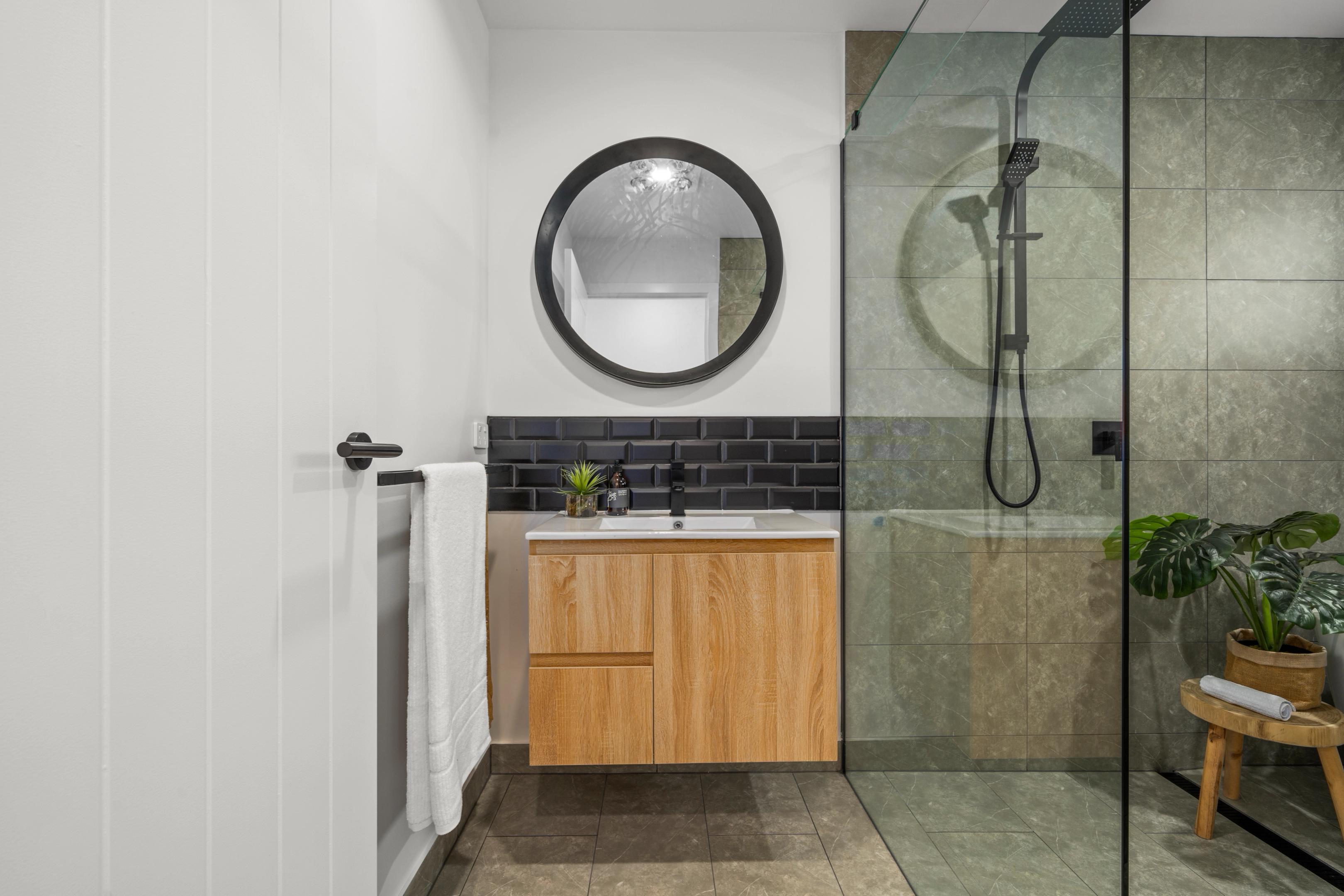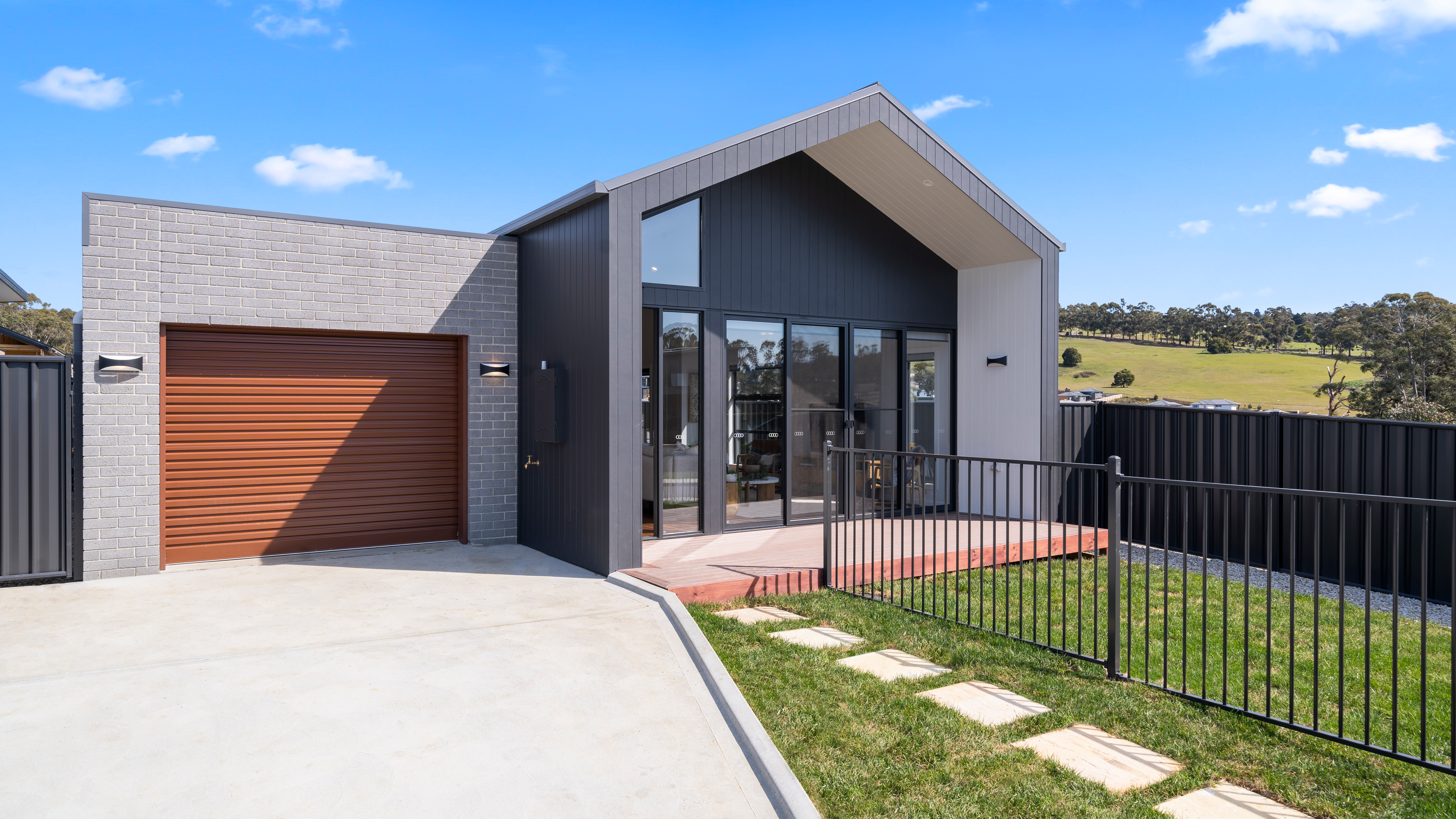 A carefully balanced palette of brick, dark cladding and crisp detailing creates contrast and depth. The timber-look garage door introduces warmth, softening the darker façade and delivering a refined modern rural aesthetic — perfectly suited to Kingston and its surrounding landscape.