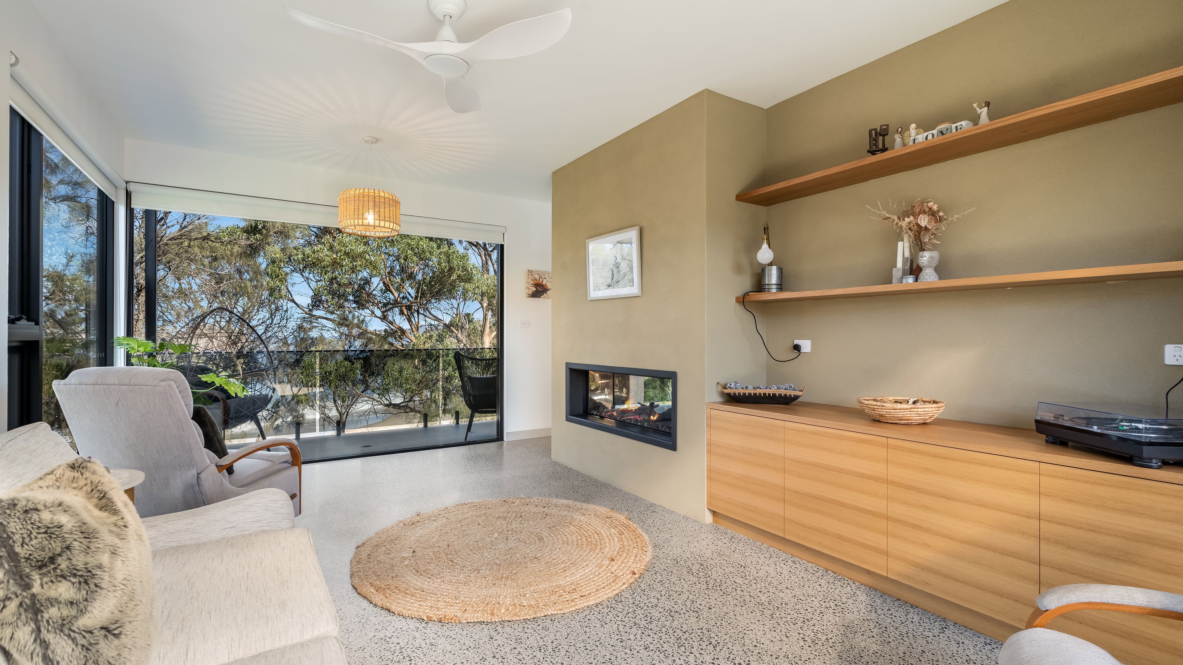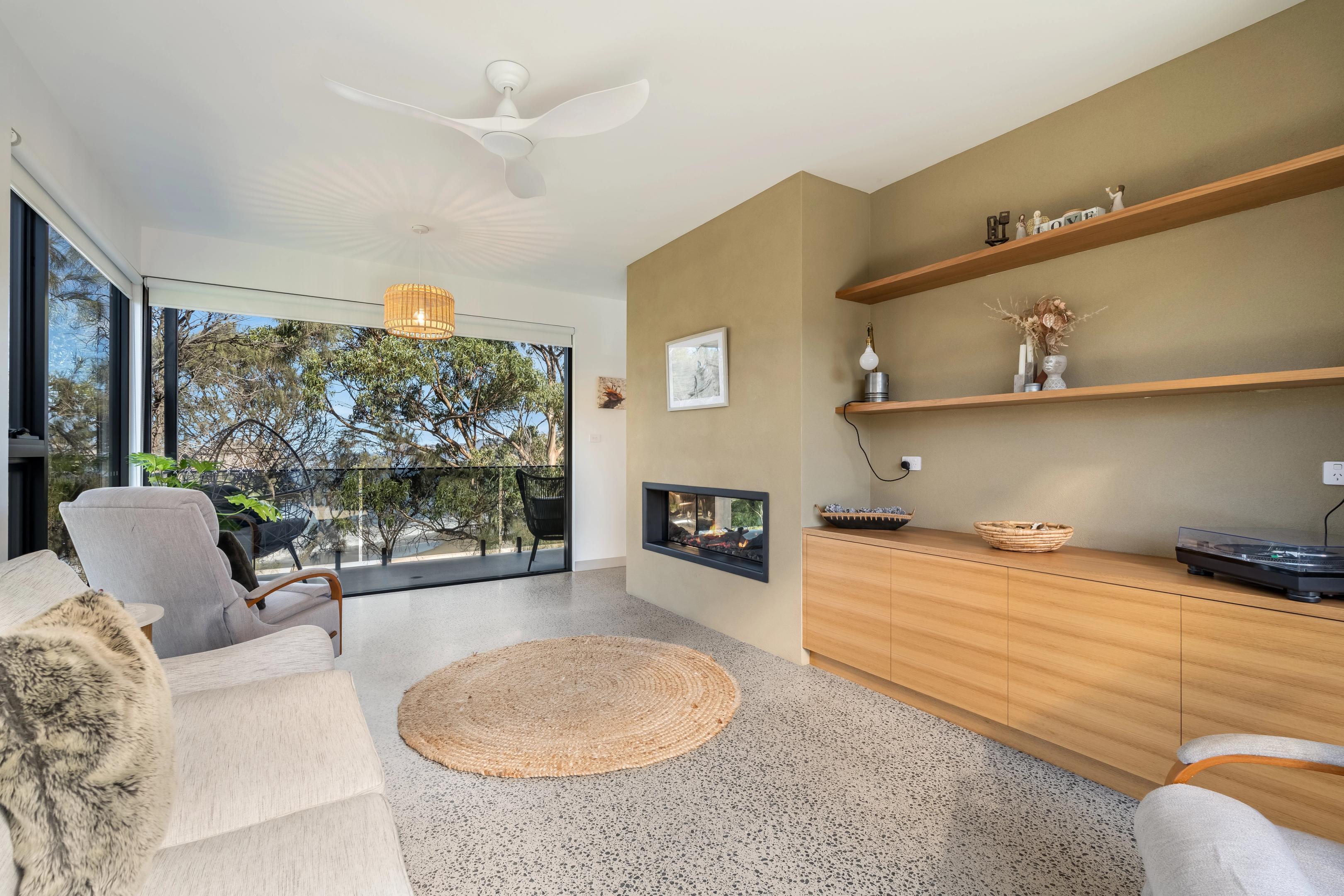The expansive open-plan living area forms the heart of the home. A feature gas fireplace anchors the space, providing warmth and ambience through the cooler Tasmanian months.