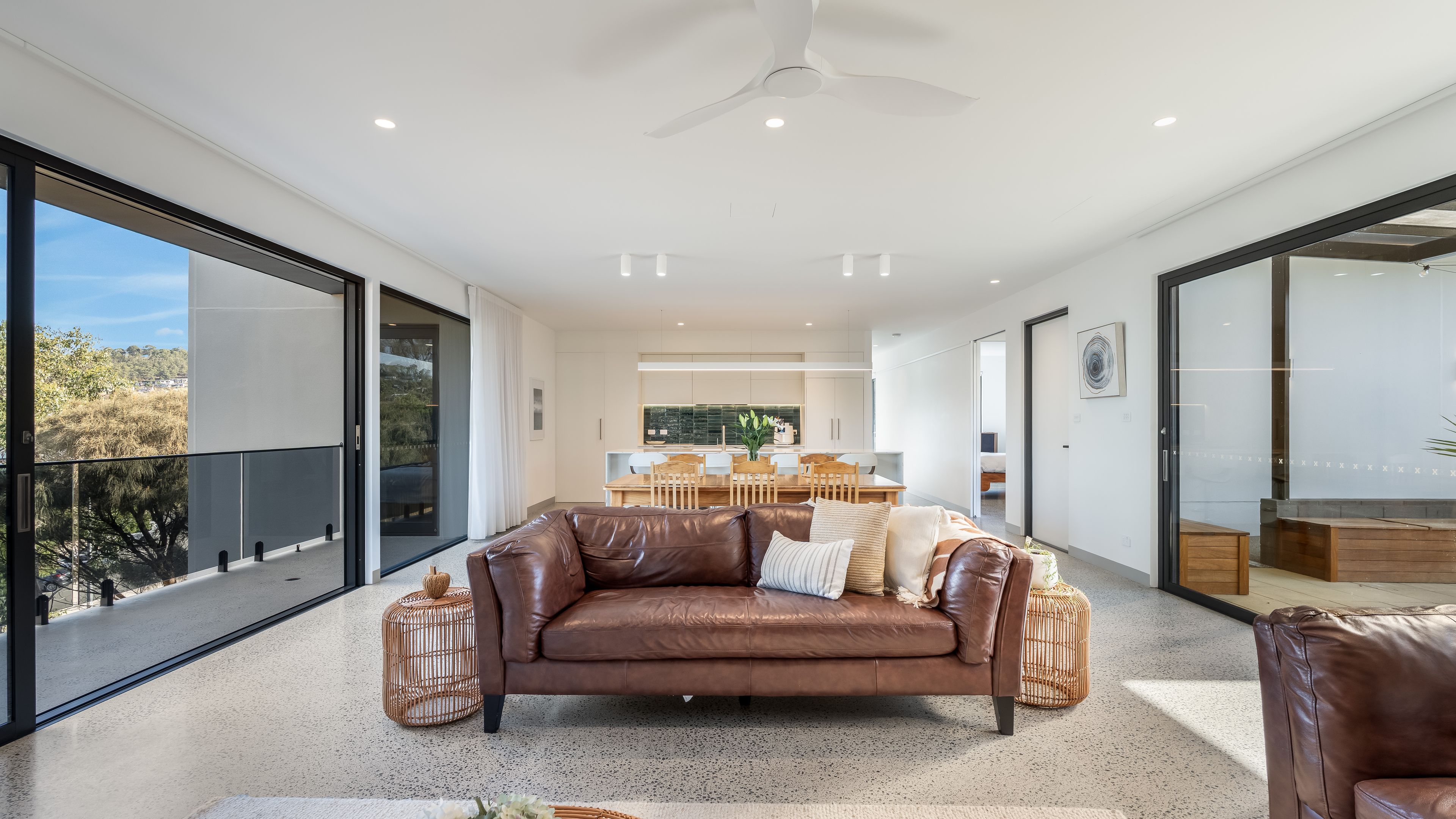 Large openings connect the interior to two distinct outdoor zones:
